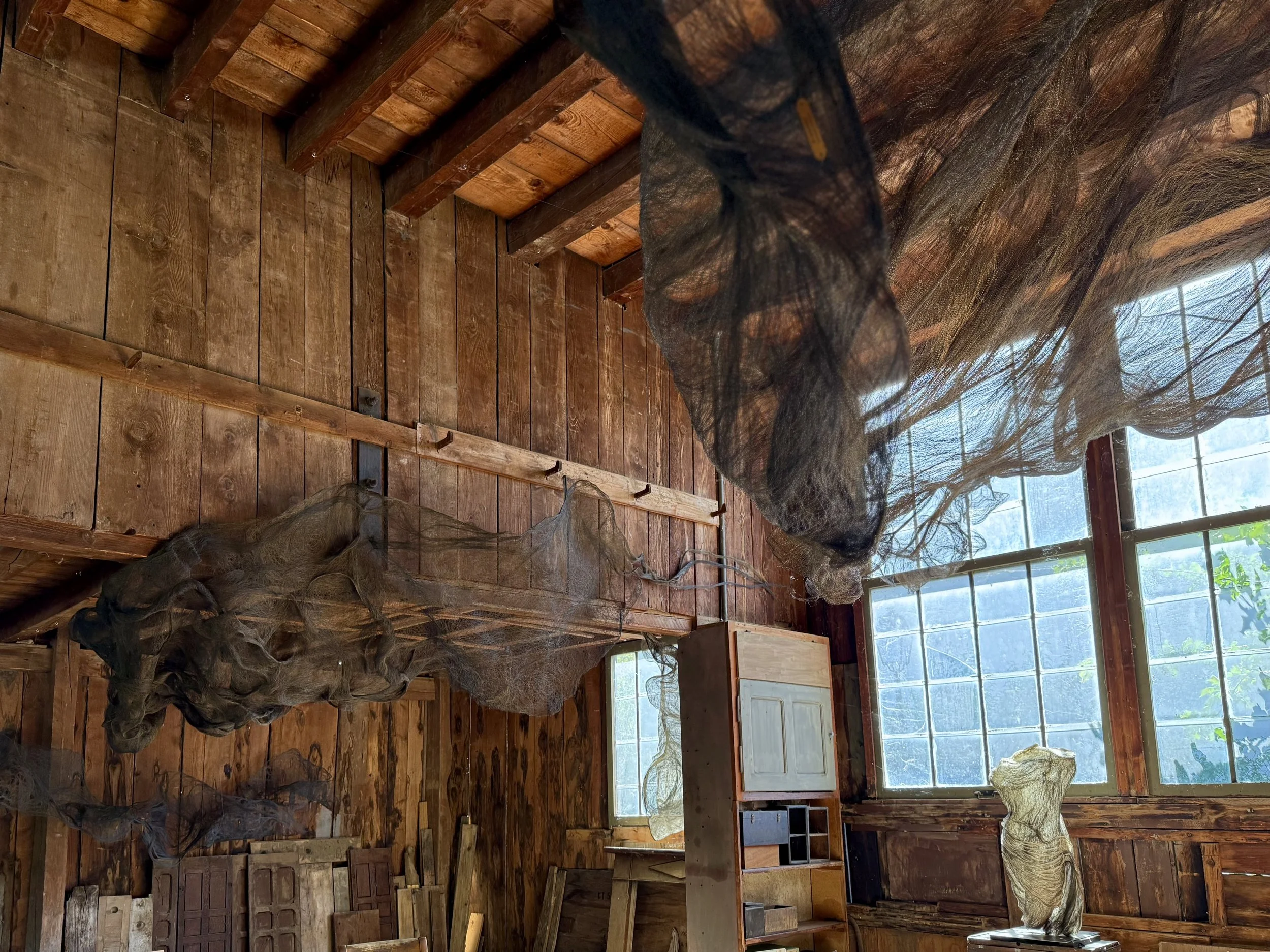 Christelle a installé plusieurs sculptures de fil avec l'envie de dialoguer avec ces immenses toiles d’araignées qui font de cet atelier un biotope unique. Ce qui permet cette prolifération, c’est l’abondance de la lumière qui inonde cet atelier de tous les côtés, et, l'artiste a placé ses « créatures de fil » de manière à capter cette précieuse énergie. Par les interstices des planches, des filets de lumière viennent traverser, fendre, jouer et projeter des ombres qui palpitent …