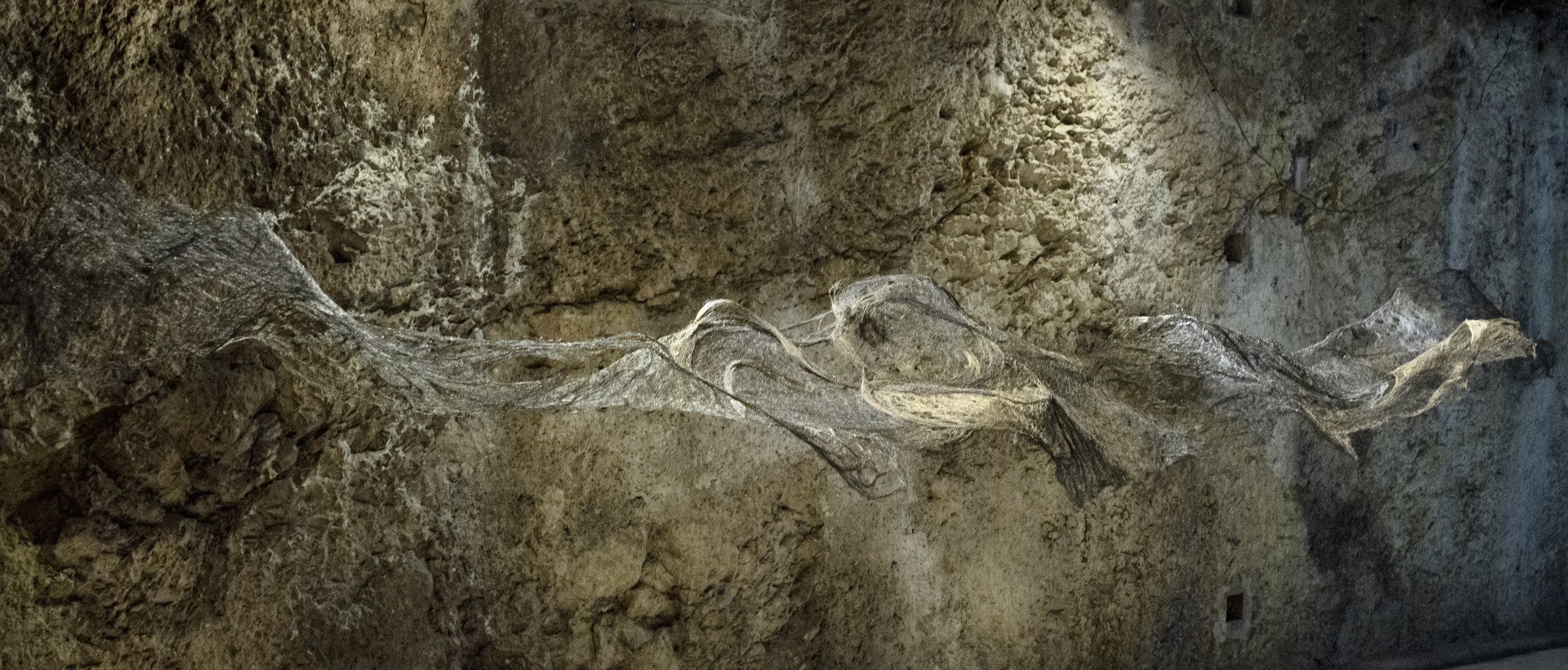“ En apparence cet objet est immobile mais les fibres qui le constituent sont comme des cils vibratiles qui palpitent sur ce plan, ils font respirer ce lieu. L’image inclinée fait de cette sculpture un monde dédoublé, un dialogue avec l’architecture et avec elle-même, mais il ne s’agit pas de duplication ou de répétition car ces projections sont aléatoires et imprévisibles. Ces ombres sont une morphologie mouvante et redonnent chair à ce squelette, elles lui donnent une épaisseur, une sonorité.